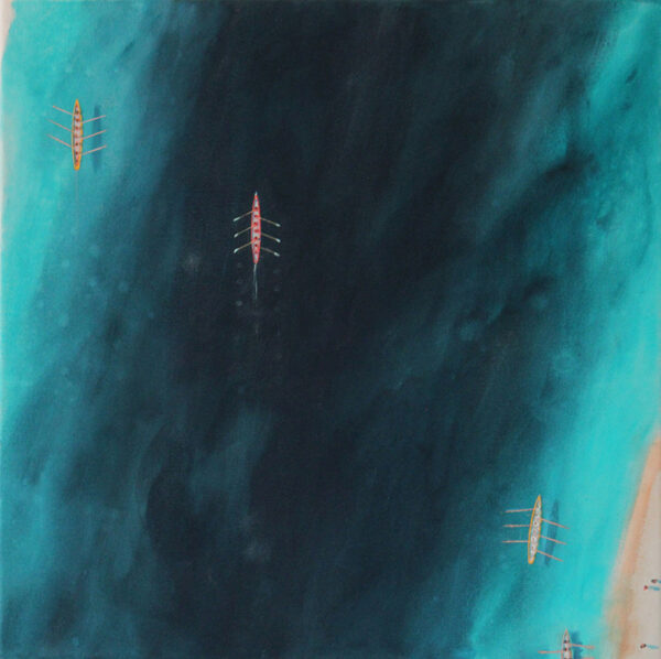 “Many of my Cornish paintings study the areas where sea meets land. I am drawn to the water – surfing, sea swimming and sailing all giving new perspectives, and for me an important part of enjoying life in Cornwall.  Another perspective is viewing the landscape from above; inspired when I was young by seeing Peter Lanyon’s painting. The grid like forms of aerial landscape and long, narrative shadows have also struck a chord with my way of working. Over the last few years, I have painted the Thames from above after a helicopter trip with fellow artist Neil Pinkett taking photographs over the bridges. I also study aerial subjects closer to home in Cornwall, using a drone to get the perspectives I need. Sea pools and seaside architecture have been a particular focus over the last winter, resulting in a new body of work for 2024.”